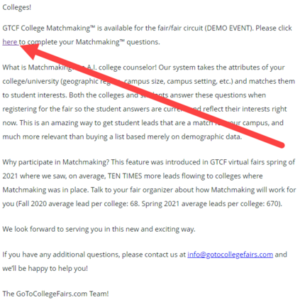 College registrants will receive an email from donotreply@gotocollegefairs.com with the subject line "Please finish your college fair registration" upon registration. This email explains what College Matchmaking® is and the associated benefits. In the email, select the hyperlink to fill out the College Matchmaking® form: