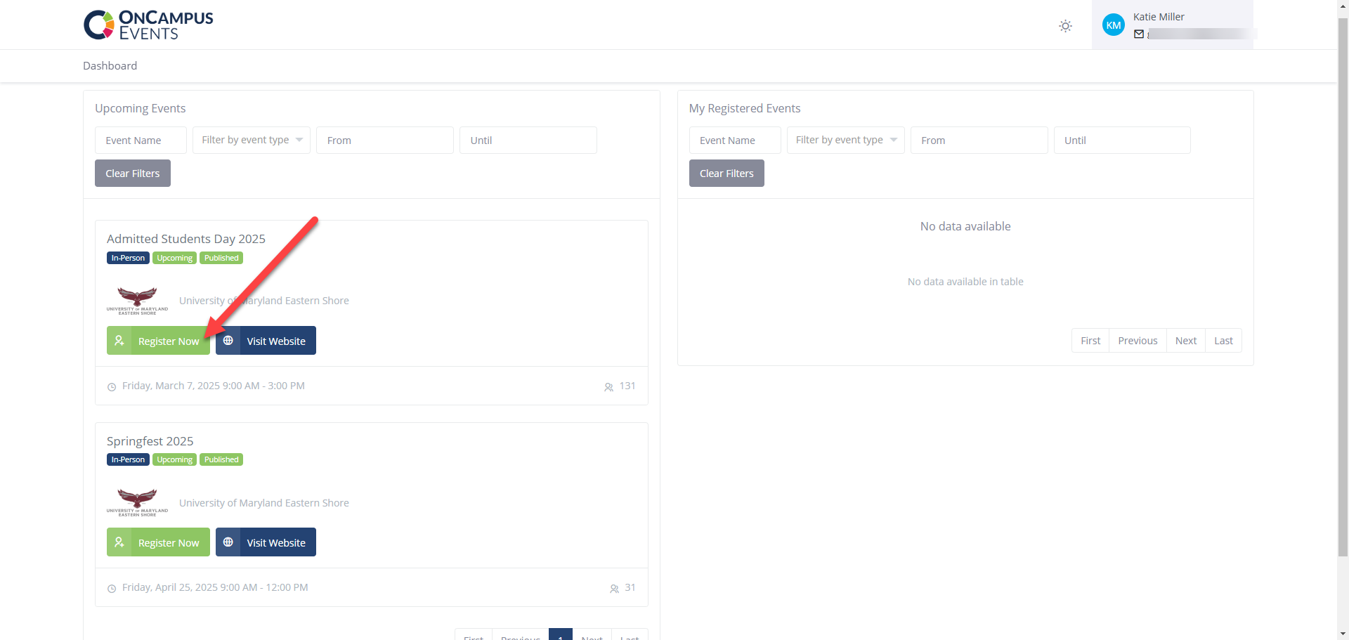 Once logged in and your profile is complete, you can return to the dashboard, where you’ll see the list of upcoming events. Simply click Register Now for any event you wish to attend.