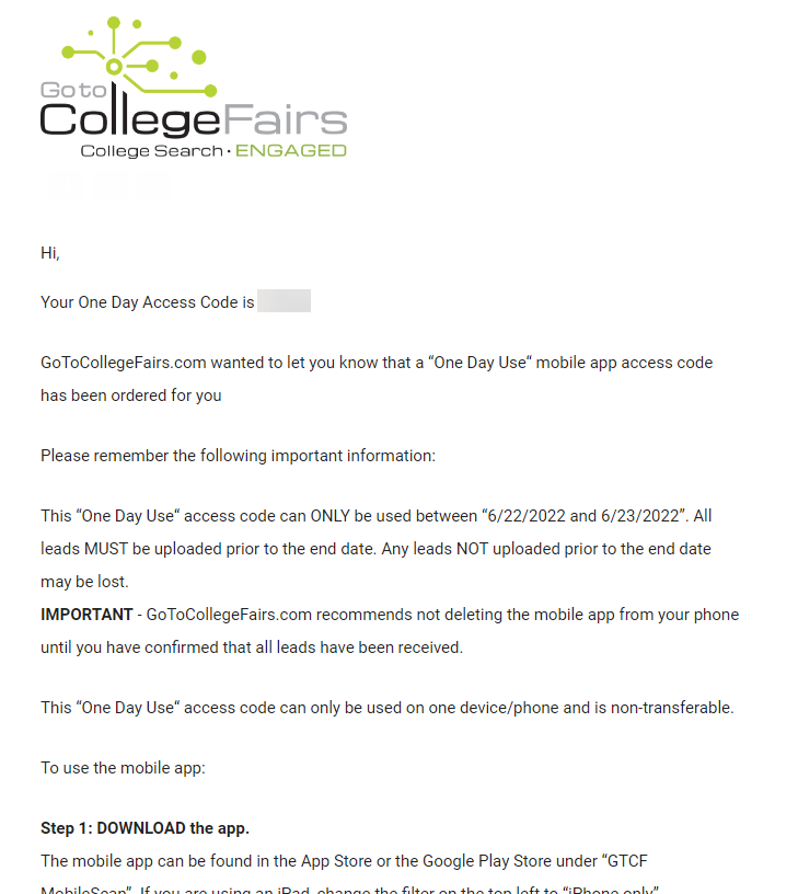 - Order an access code from https://gotocollegefairs.com/products/scanning-app/. See Related Article: How to Order an Access Code