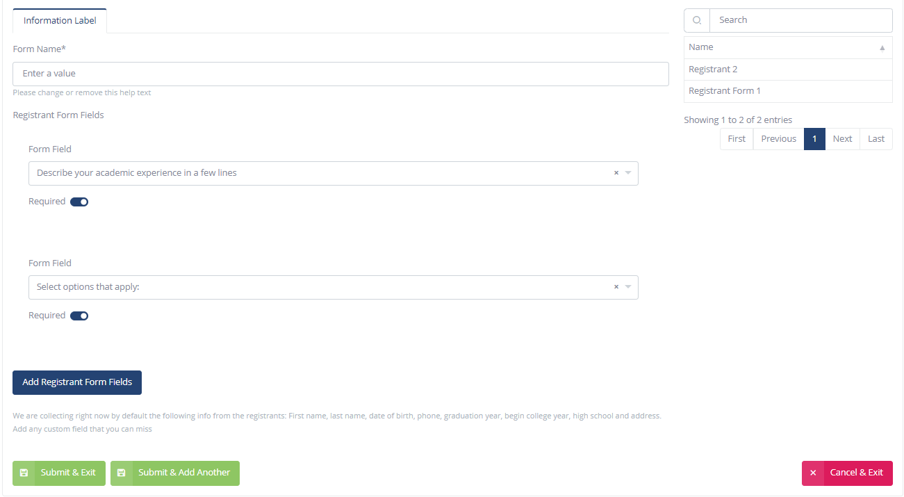 Navigate to 'Event Registration', then click 'Exhibitor Forms'. Exhibitor Form List View all created exhibitor forms. Search for a form by name. Sort the records by name or modified time using the column headers. View, edit, or delete each form using ...