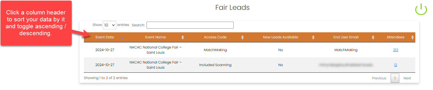 - Click the column headers to sort by Event Date, Event Name, or New Leads Available.