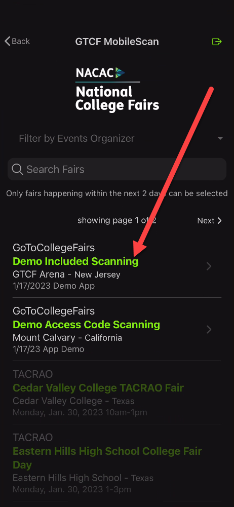 Open the GTCF MobileScan App and tap the 'College Fairs' button.