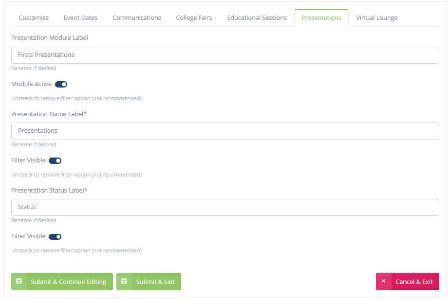- Presentations Module Label: This label is 'Presentations' by default. Rename if desired.